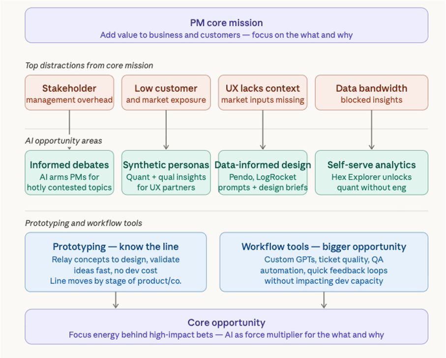 Ever evolving AI tools are reducing time from concept to production by helping with product planning, requirements documentation, and prototyping that gives PM more opportunity to help with product design and development collaboration, release management, and more revenue ownership of their products.